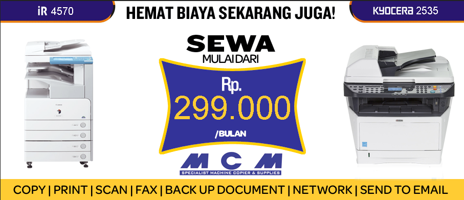 Hemat biaya sekarang juga! Rental mesin fotocopy Console (Canon iR 3300/4570/3020/3240)(iR Advance 4035/6055/6065) atau Portable (Kyocera 1120/2535/2540/6530) dengan fitur copy, print, scan, fax, back up document, network, send to email. Hubungi kami di (62-21)631 8655 atau 638 60575 sekarang juga!